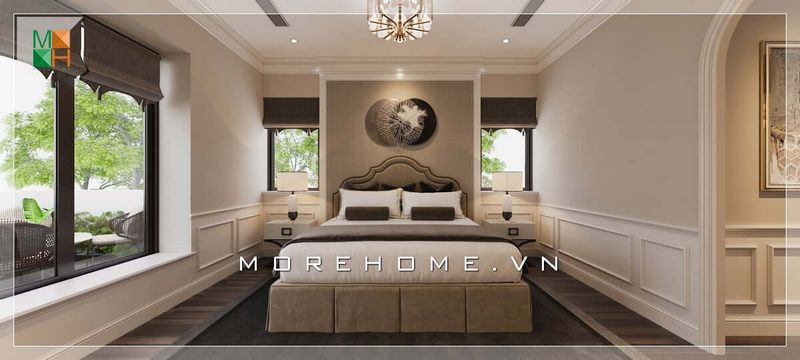 Mẫu giường tân cổ điển màu sắc trung tính sang trọng phù hợp với không gian phòng ngủ cao cấp.