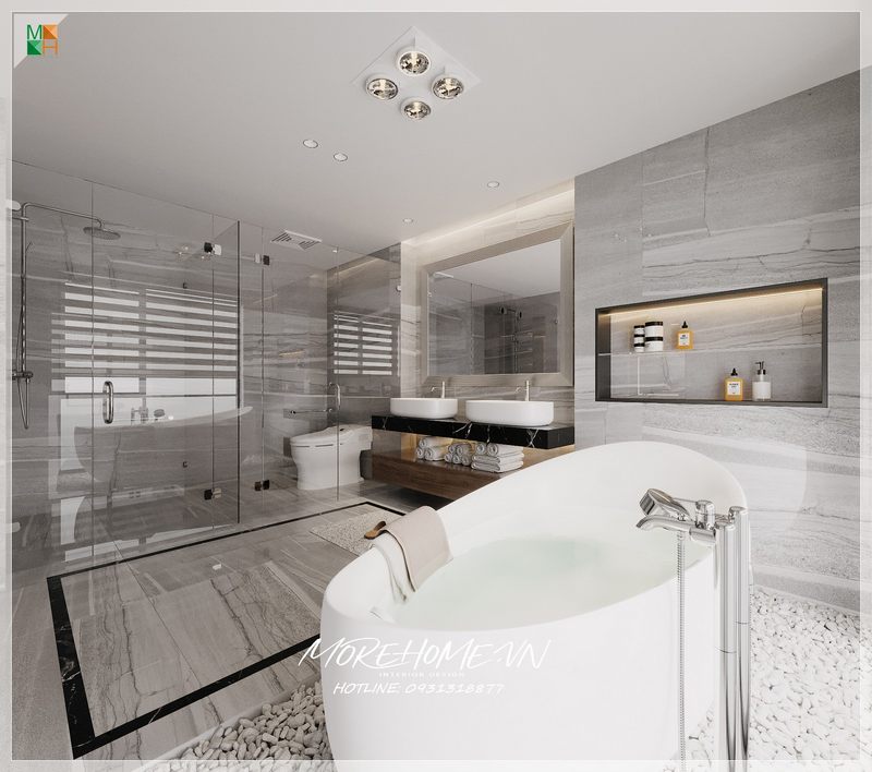 Mẫu thiết kế nội thất phòng tắm hiện đại với màu trắng tinh tế và sang trọng, trang nhã.